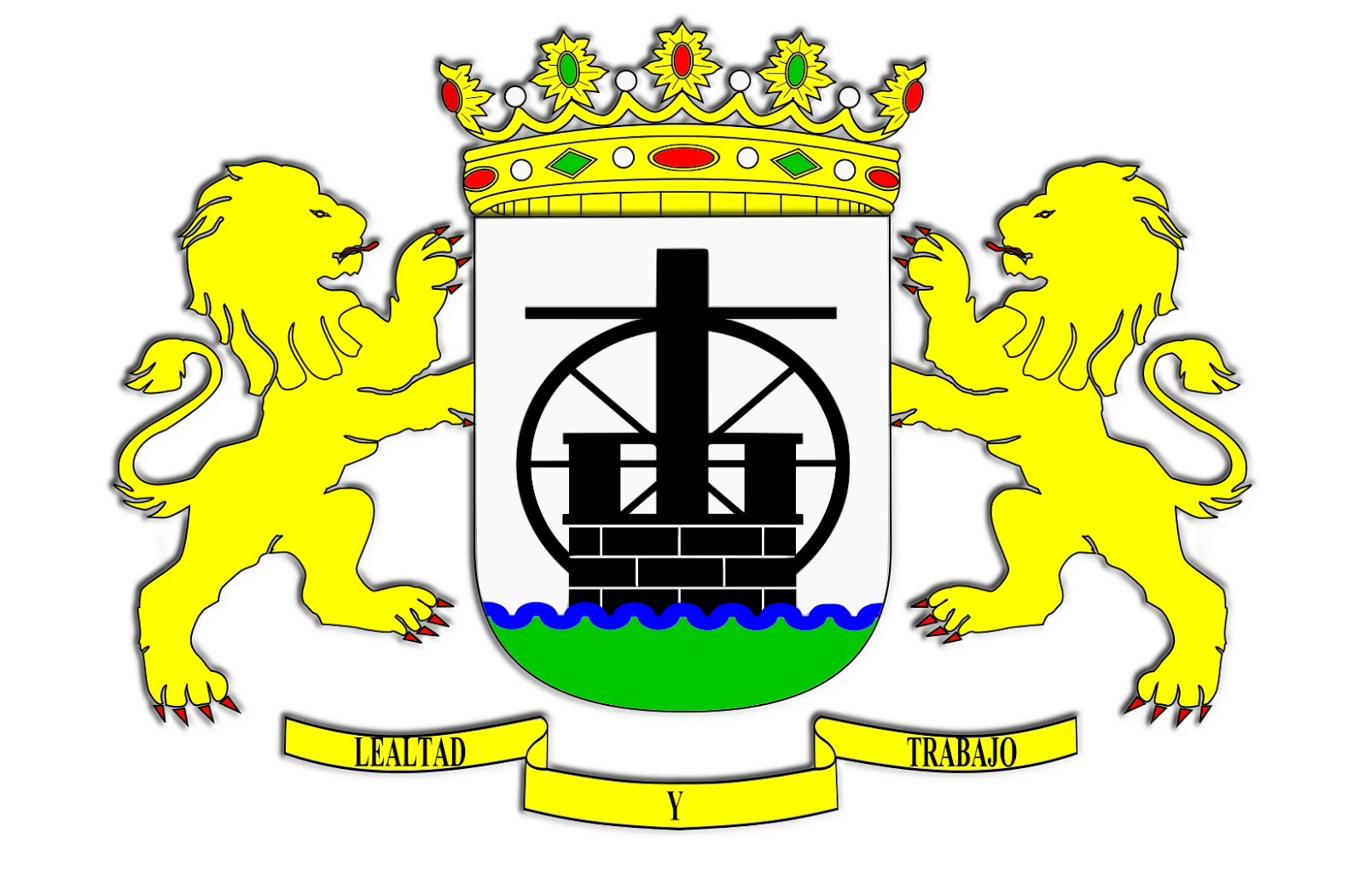 Los soportes, aunque elementos externos, también deben estar descritos y el esmalte heráldico con mayor semejanza al usado es el oro (amarillo), usualmente representados los leones armados y lampasados de gules (rojo). Por tanto, "Escudo de plata, el ingenio de moler caña de sable, sostenido de onda de azur y terrazado de sinople. Al timbre, corona real abierta. Como soportes, dos leones de oro, armados y lampasados de gules. Cinta de oro con la leyenda 'Lealtad y Trabajo' en letras de sable".